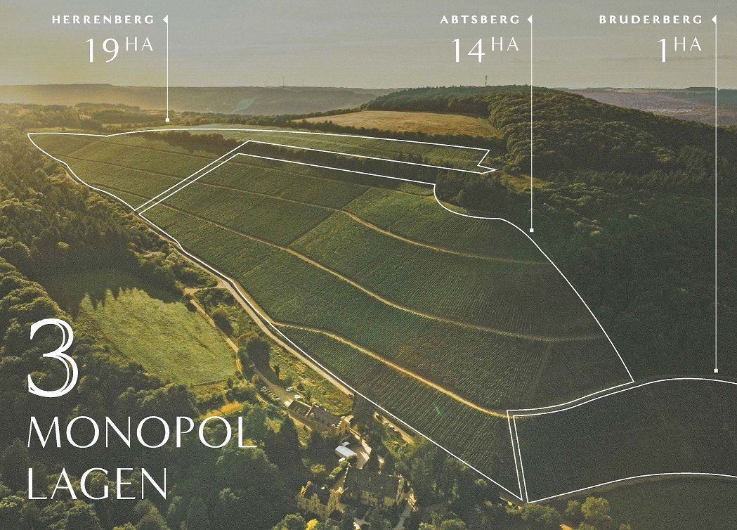Auf 34 Hektar werden 90% Riesling , 5% Pinot Noir und 5% Pinot Blanc mit höchsten Qualitätsansprüchen angebaut und spontan vergoren. Die Reben wachsen auf drei Monopollagen direkt gegenüber des Anwesens. Alle drei Lagen sind als VDP.GROSSE LAGEN klassifiziert und sind nach der alten Klosterhierarchie benannt: Bruderberg, Herrenberg und Abtsberg. Hier entstehen Weine mit Weltruf.